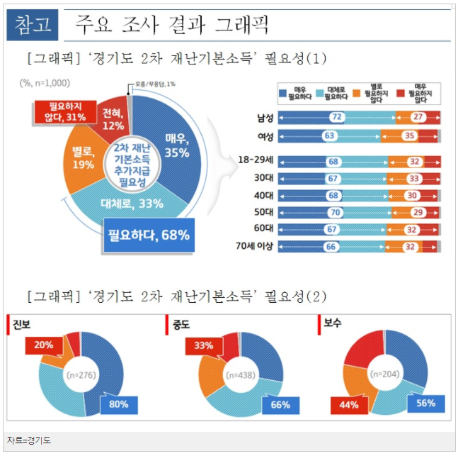 경기도는 여론조사기관을 통해서 경기도민 1000명에게 재난기본소득에 대해서 조사를 했는데 68%가 필요하다고 답했습니다. 또한 응답자의 70%는 경기지역화폐로 지급되면 코로나19로 위축된 소비를 촉진시켜 경제활성활에 도움이 될것이라고 답했다.