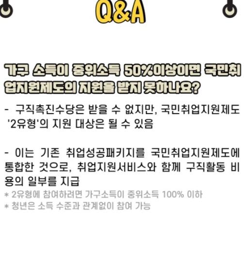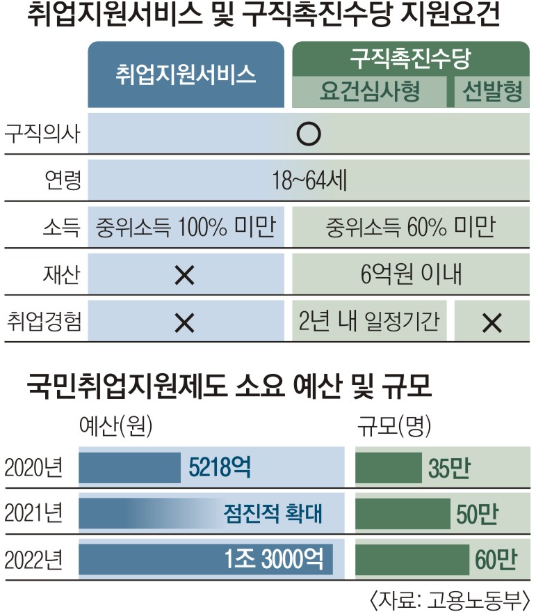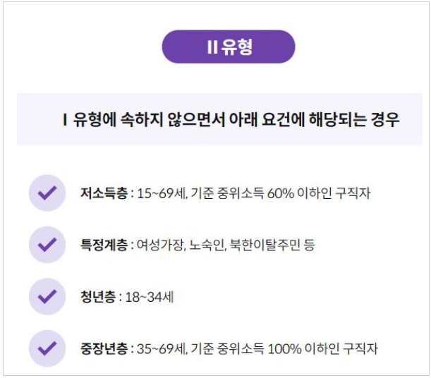 ● 요건심사형 : 15~69세 구직자 중 가구단위 중위소득 50%이하 & 재산 3억이하이면서, 취업경험(최근2년이내 100일 또는 800시간이상)이 있을것