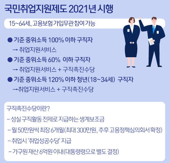 구직촉진수당은 정부에서 지원하는 국민취업지원제도 입니다. 국민취업지원제도는 2021년 1월 1일부터 시행되며 취업지원서비스를 종합적으로 제공하고 저소득 구직자, 폐업한 영세 자영업자, 미취업 청년등을 대상으로 정부에서 매월 50만원의 구직촉진수당을 6개월동안 지원하여 구직하는데 도움을 주기위한 제도입니다.