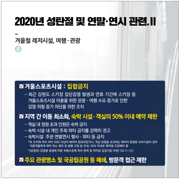 13. 숙박업소는 이용목적에 따라 제한을 받는다. 업무수행, 기업의 필수경영활동으로 불가피한 출장, 거주공간이 동일한 가족의 경우등은 객실 정원에 따라 이용 가능하다. 사적모임인 경우에는 객실 정원 내에서 4명까지만 이용할수 있다.