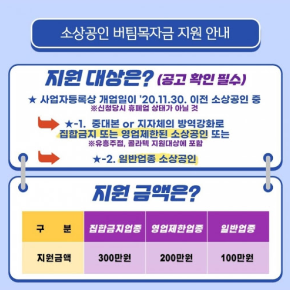 - 11월 24일 이후 집합금지. 영업제한 대상, 기존 새희망자금 일반업종 기수급자