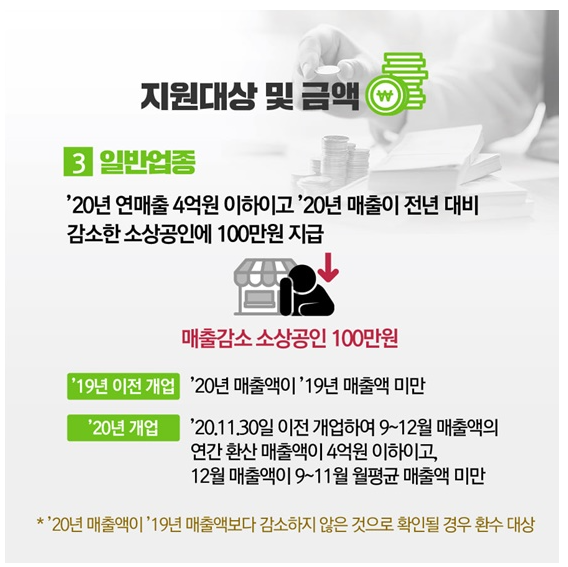 ■ 2020년도 매출 4억원이하이고 2020년 매출이 전년대비 감소한 소상공인에 100만원 지원