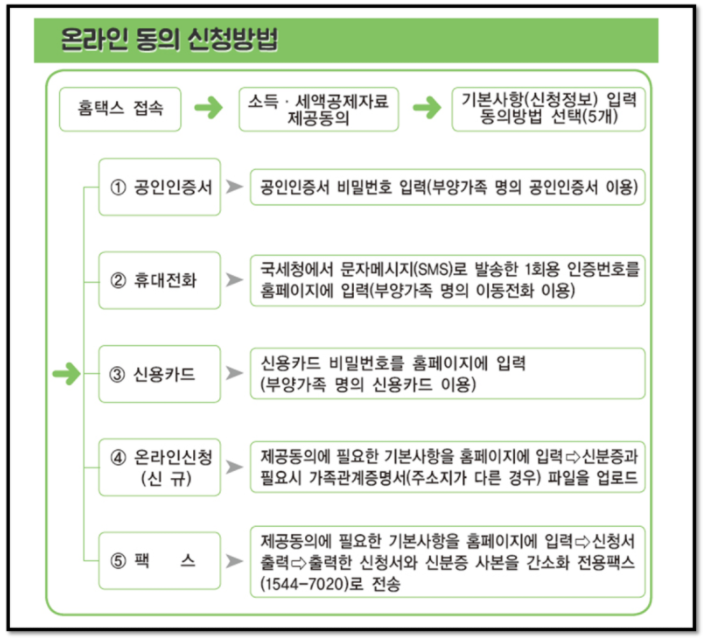 부양가족의 소득과 세액공제 자료를 조회하기 위해서는 연말정산간소화 홈페이지에서 부양가족 자료제공동의를 필수로 해줘야 조회가 가능합니다. 동의를 하지않으면 부양가족에 대한 자료를 직접 받아서 입력을 해야하는데 그런경우 너무 번거롭게 되니 부양가족 명의로 연말정산간소화 홈페이지에 접속 후 자료제공 동의를 해주시면 간단하게 조회하여 제출할수 있습니다. 부양가족 자료 제공동의 신청시 공인인증서나 휴대전화, 신용카드 등으로 본인인증후 신청하시면 됩니다.
