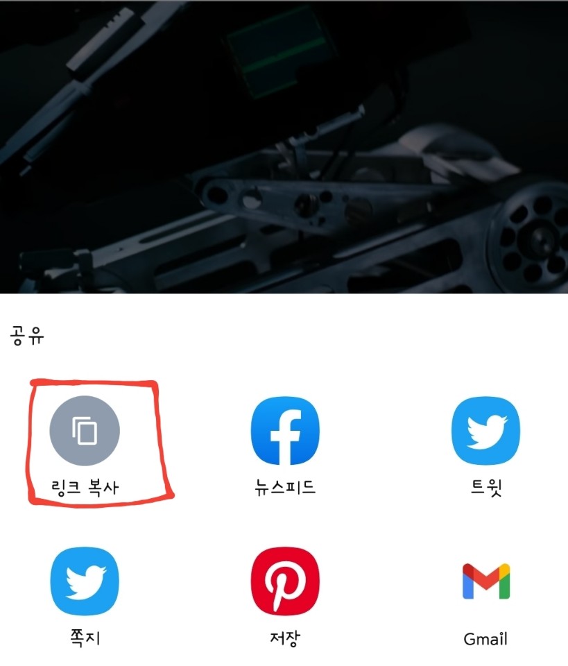 공유에 보시면 링크복사가 있습니다. 링크복사를 눌러 유튜브주소를 복사해 줍니다.