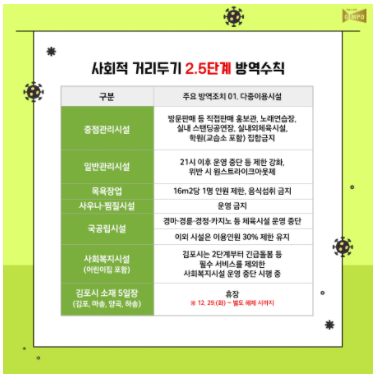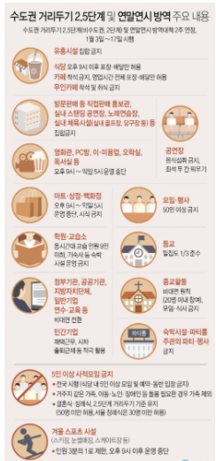정부는 코로나19로 인한 사회적거리두기 5인이상 집합금지를 2주 더 연장하기로 하였습니다. 수도권은 2.5단계, 비수도권은 2단계를 1월 31일까지 연장한다는 방침입니다.
